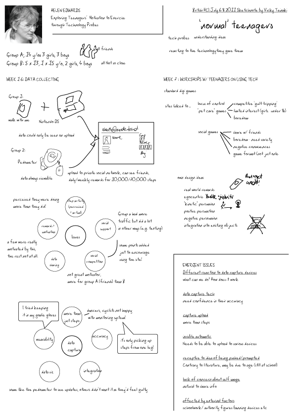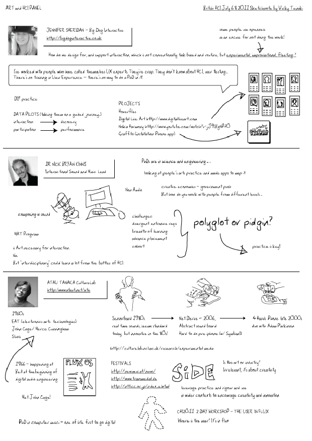 I sat in on a number of the British HCI talks with a laptop and Wacom tablet, and captured notes from Abigail Sellen's keynote presentation, and some panels. The attached PDFs have clickable links and selectable text if the images aren't enough.