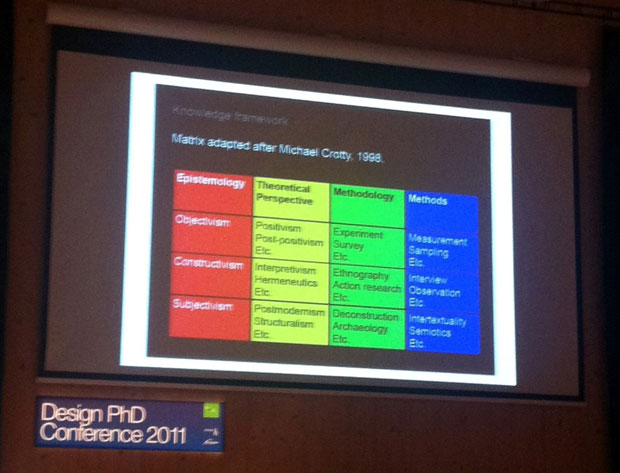 Luke Feast of Swinburne University is an ethnographer looking into design methods. This meant he gave us a number of useful knowledge frameworks (objectivism, constructivism, subjectivism) as well pointing to researchers such as Rittel & Schon.