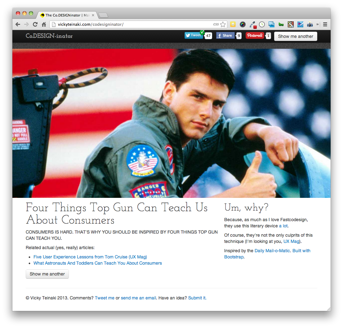 I’ve also been a fan of how Jessica Hische quickly knocks up websites whenever she has a message she wants to get across e.g. http://shouldiworkforfree.com and http://quotesandaccents.com. So, in a post-supervision meeting lull (at Northumbria we meet with our supervisors every two weeks, for me it’s a Tuesday), I decided to embrace what she calls ‘procrasti-working’ and make a Fastcodesign-style “What X can teach us about Y” generator.