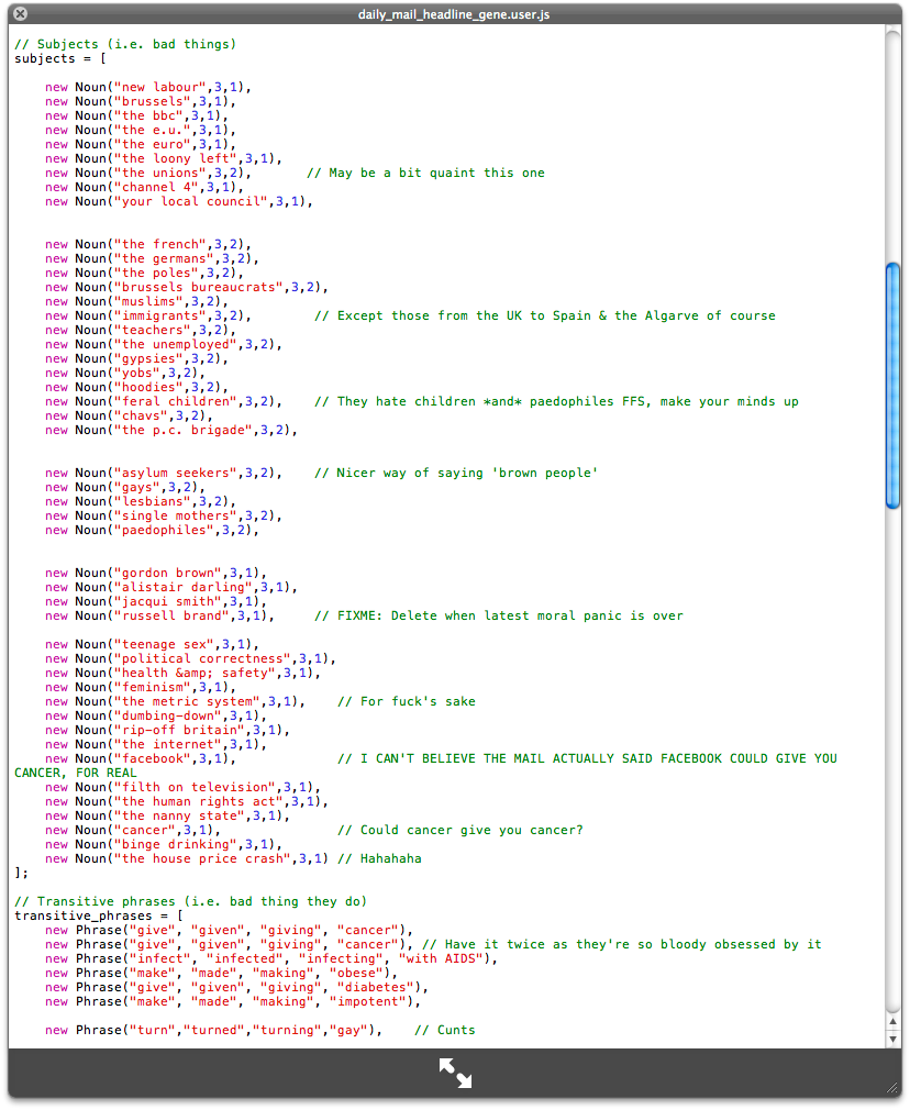 The comments on the Greasemonkey script for that generator are also the funniest thing I’d seen on the internet for ages (though admittedly hilarity does circle around the Daily Mail like vultures to carrion).
